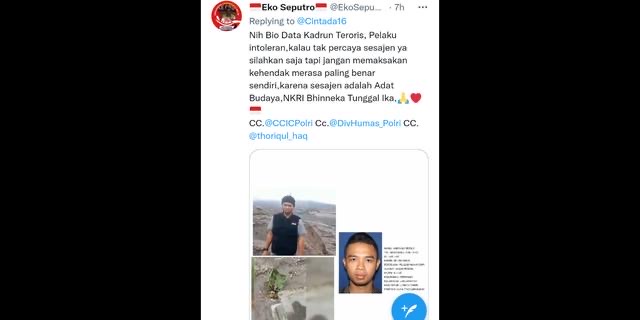 “Nih Bio Data Kadrun Teroris, Pelaku intoleran,kalau tak percaya sesajen ya silahkan saja tapi jangan memaksakan kehendak merasa paling benar sendiri, karena sesajen adalah Adat Budaya, NKRI Bhinneka Tunggal Ika,” cuit netizen EkoSepu21260933.