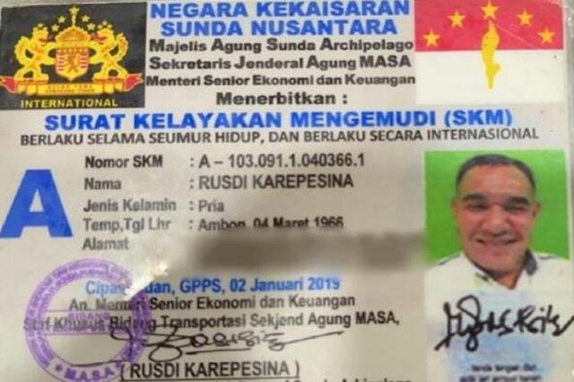 SIM A milik Rusdi diterbitkan Negara Kekaisaran Sunda Nusantara. Masa berlakunya seumur hidup.