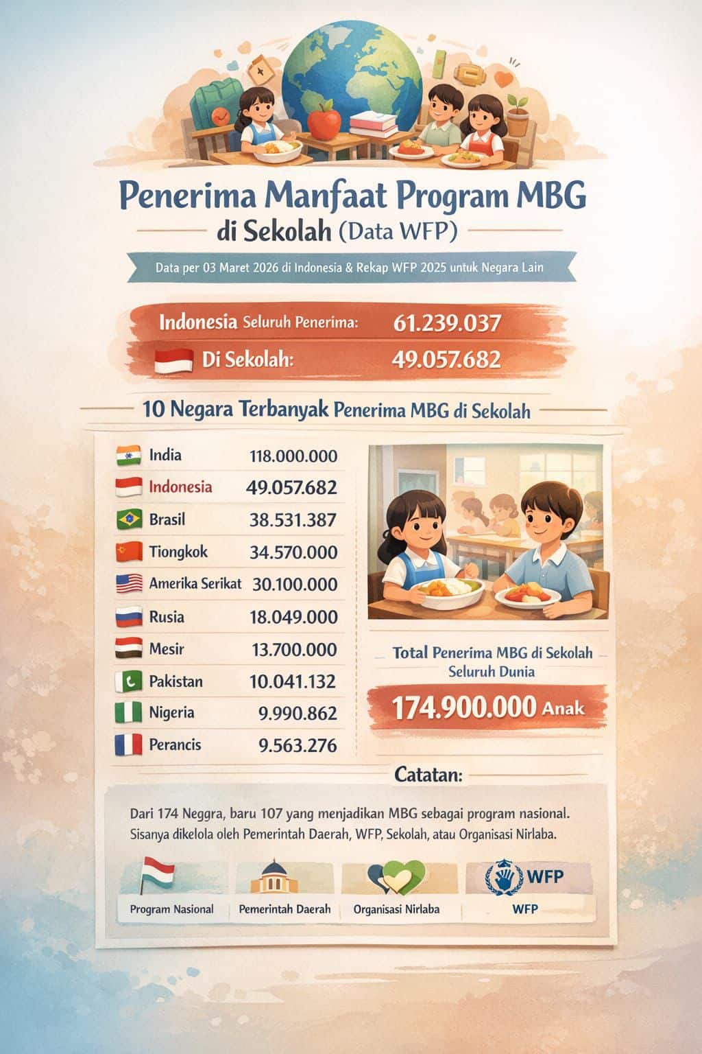 Berdasarkan data per 3 Maret 2026, jumlah penerima manfaat program MBG di Indonesia mencapai 61.239.037 orang, dengan 49.057.682 di antaranya merupakan siswa di sekolah.